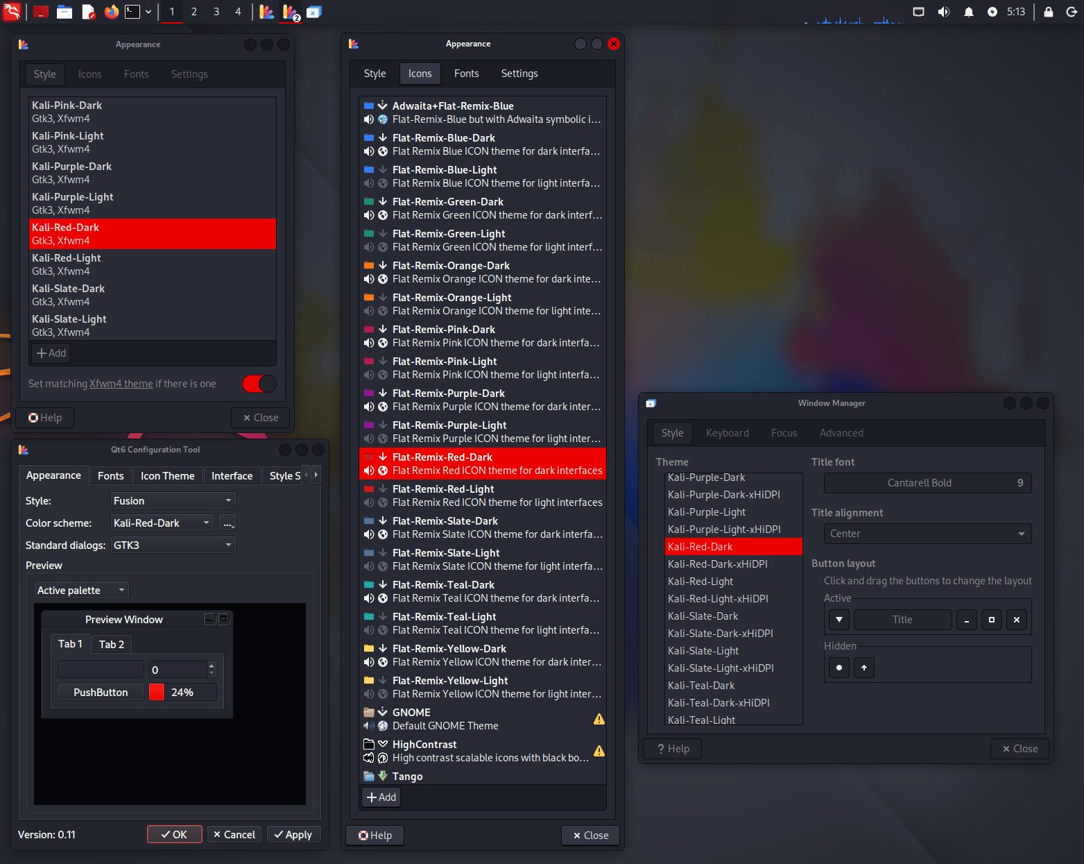 All these settings can be changed through the “Appearance” application, except for Qt programs, which require separate themes and can be tweaked through qt5ct or qt6ct (both installed by default).